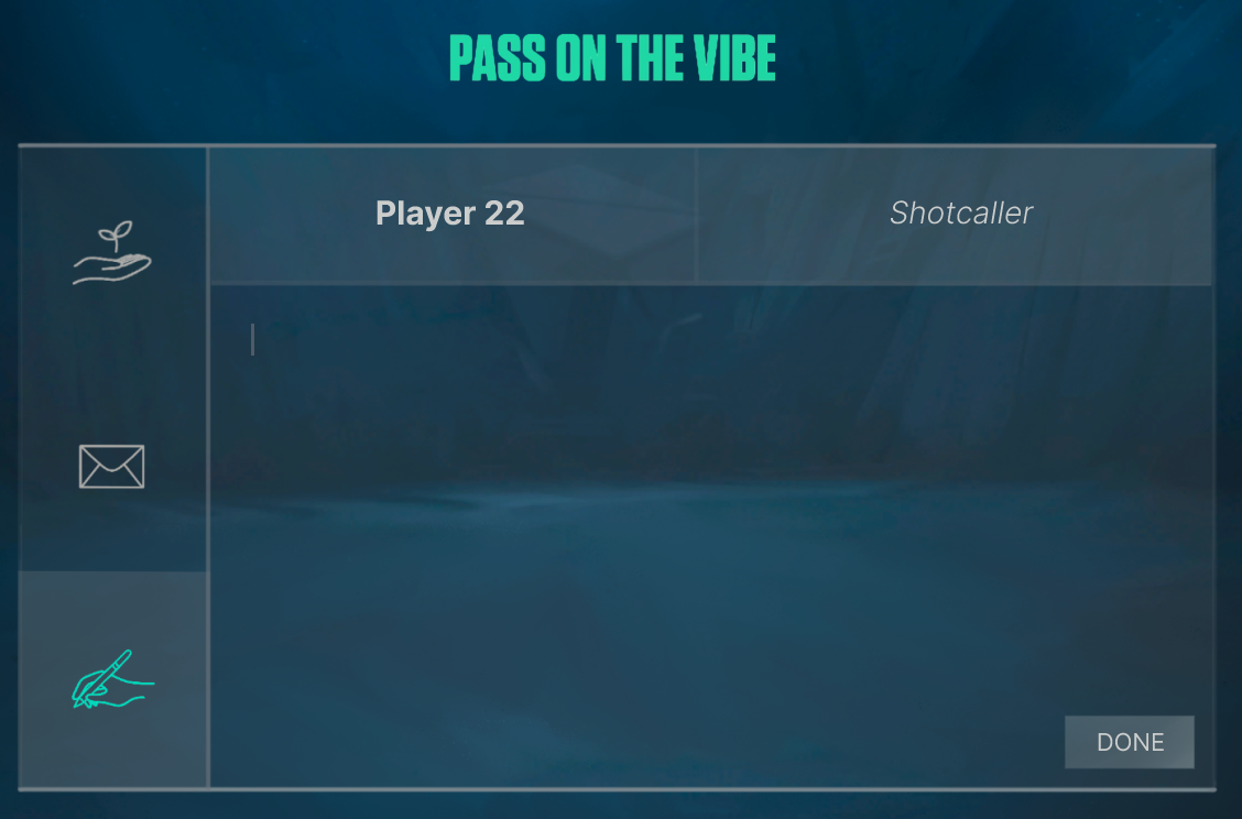 Jeg tog udgangspunk i spillet VALORANT, hvor jeg gerne ville gøre det lettere for spillere at skabe positive oplevelser. Gennem research og interviews fandt jeg frem til, at gode handlinger ofte går ubemærket hen, og at det kræver en del mental energi at påvirke stemningen i spillet. Derfor ville jeg designe et system, der kunne undersøge hvordan man kunne ændre spilleres adfærd.